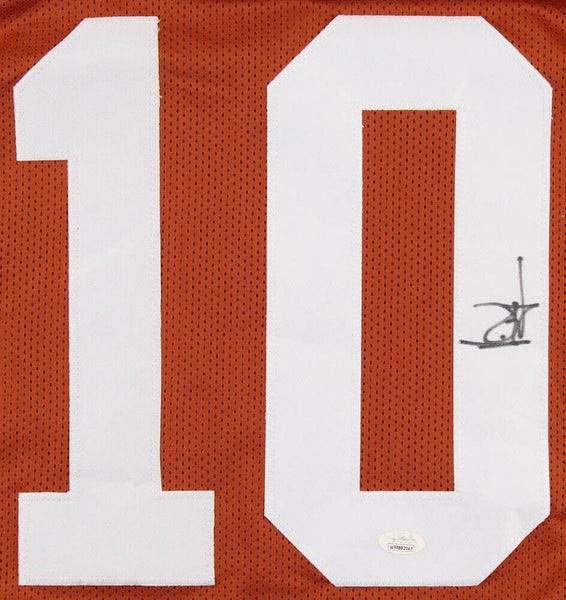 Custom on-field style jersey. Everything is sewn on, size XL. Hand-signed in black felt-tip pen by Vince Young. The lot / autograph(s) includes an official James Spence Authentication (JSA) hologram and QR Code Card for authenticity purposes. The signing of this item was witnessed by JSA.Authentication: JSA Hologram with QR Code Card