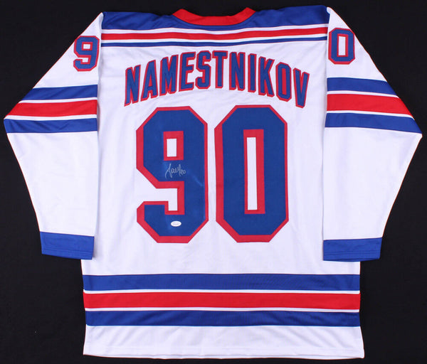 Custom on-ice style jersey. Everything sewn on, size XL. Hand-signed in silver paint pen by Vladislav Namestnikov. The lot / autograph(s) includes an official James Spence Authentication (JSA) hologram and matching COA for authenticity purposes. The signing of this item was witnessed by JSA.Authentication: JSA COA