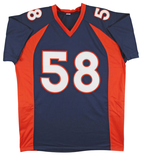 This Autographed Navy Blue Pro Style Jersey has been Personally Signed by Von Miller of the Denver Broncos. This item is 100% Authentic to include a hologram by Beckett Authentication Services. This item will come with an affixed Beckett Authentication Services (BAS) authentication sticker, which includes a scannable QR code to verify authenticity. Please note that Beckett no longer provides serial-numbered COA cards, and the attached BAS sticker will serve as the complete authentication for this item. This is a BAS Witnessed Protection Program item which means a Beckett Authentication Service representative was present when this item was being signed. We conducted an autograph signing with Von Miller where multiples of the same item were signed. While the photographs are representative of this item, the size, placement and strength of the signature may vary. Each item is hand signed, therefore, each autograph is unique. This item can be verified through BAS Witnessed. This is a X-Large sized, non-branded, custom-stitched Jersey.
