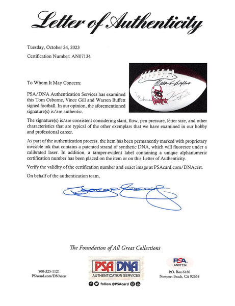 This Autographed Nebraska Cornhuskers White Panel Logo Football has been Personally Signed by Warren Buffett, Tom Osborne & VInce Gill. This item is 100% Authentic and comes with a PSA/DNA Certification Card and a matching numbered Hologram. The authenticity can be verified on Professional Sports Authenticator website.