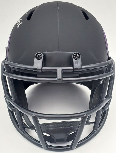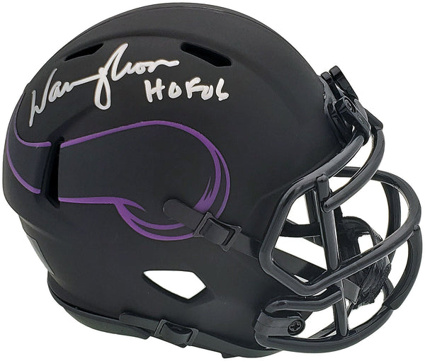 This is a Minnesota Vikings Eclipse Black Mini Helmet that has been hand signed by Warren Moon. The Eclipse helmets are very delicate and often have some marks or scratches on them. This item was inscribed "HOF 06." This item was signed in the presence of a Mill Creek Sports representative and comes with their serial numbered hologram and matching certificate of authenticity.