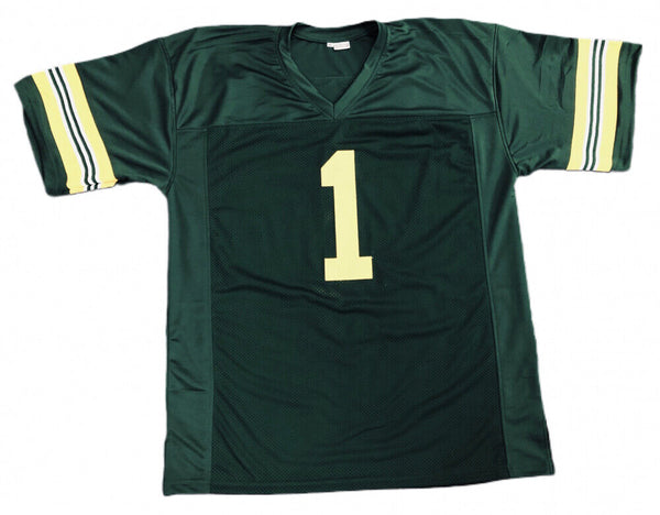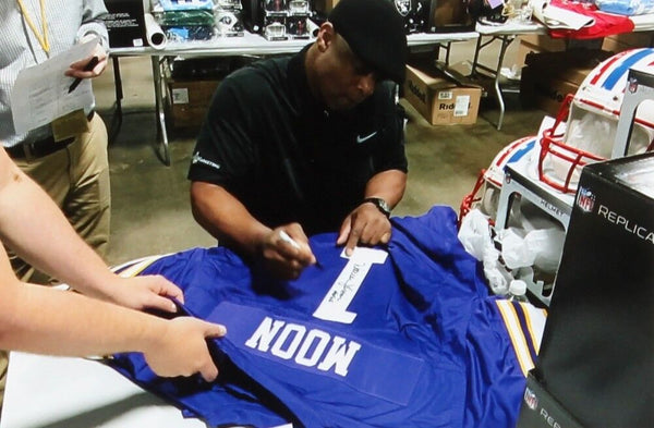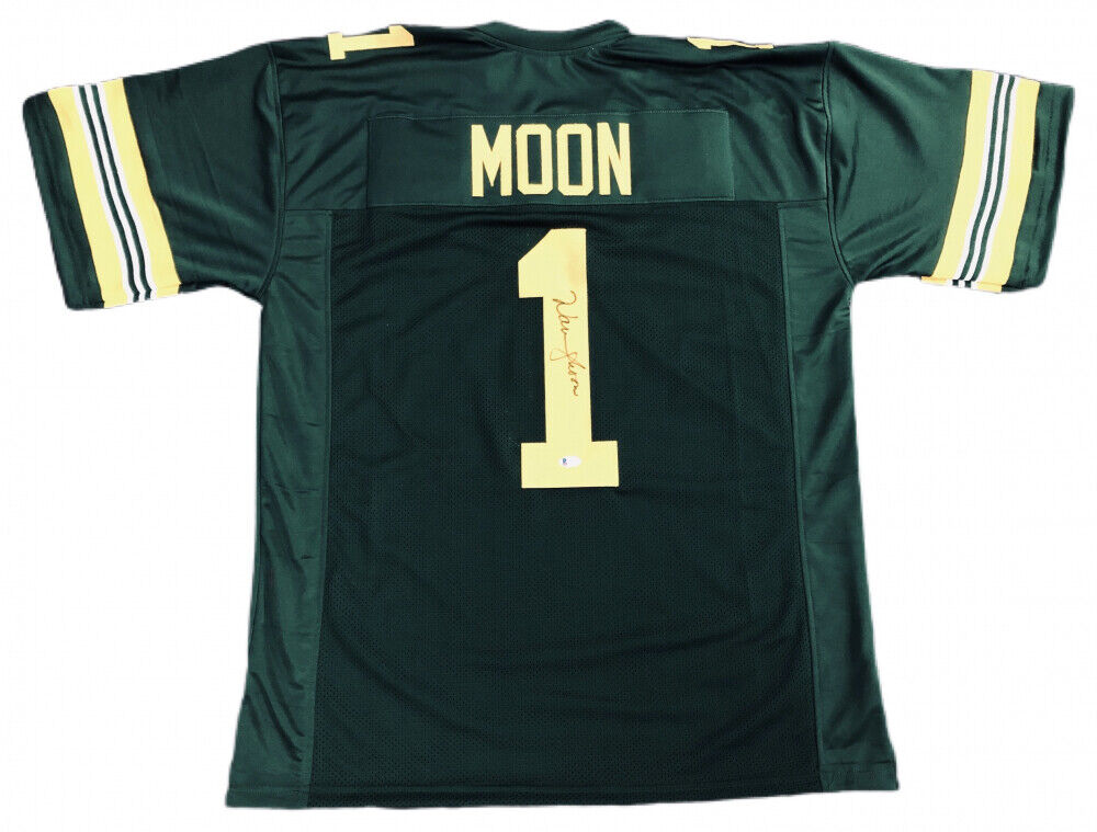Custom on-field style jersey. Everything is sewn on, size XL. Has been hand-signed in black felt-tip pen by Warren Moon (HOF). The lot / autograph(s) includes an official Beckett Authentication Services serially-numbered hologram and matching COA for authenticity purposes. The signing of this item was witnessed by Beckett.Authentication: Beckett COA