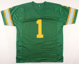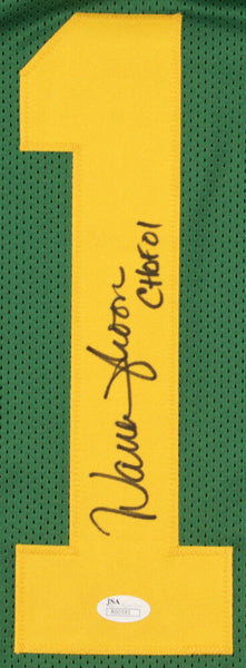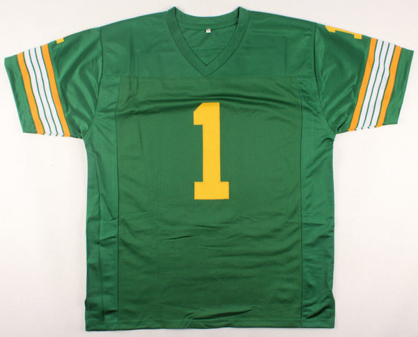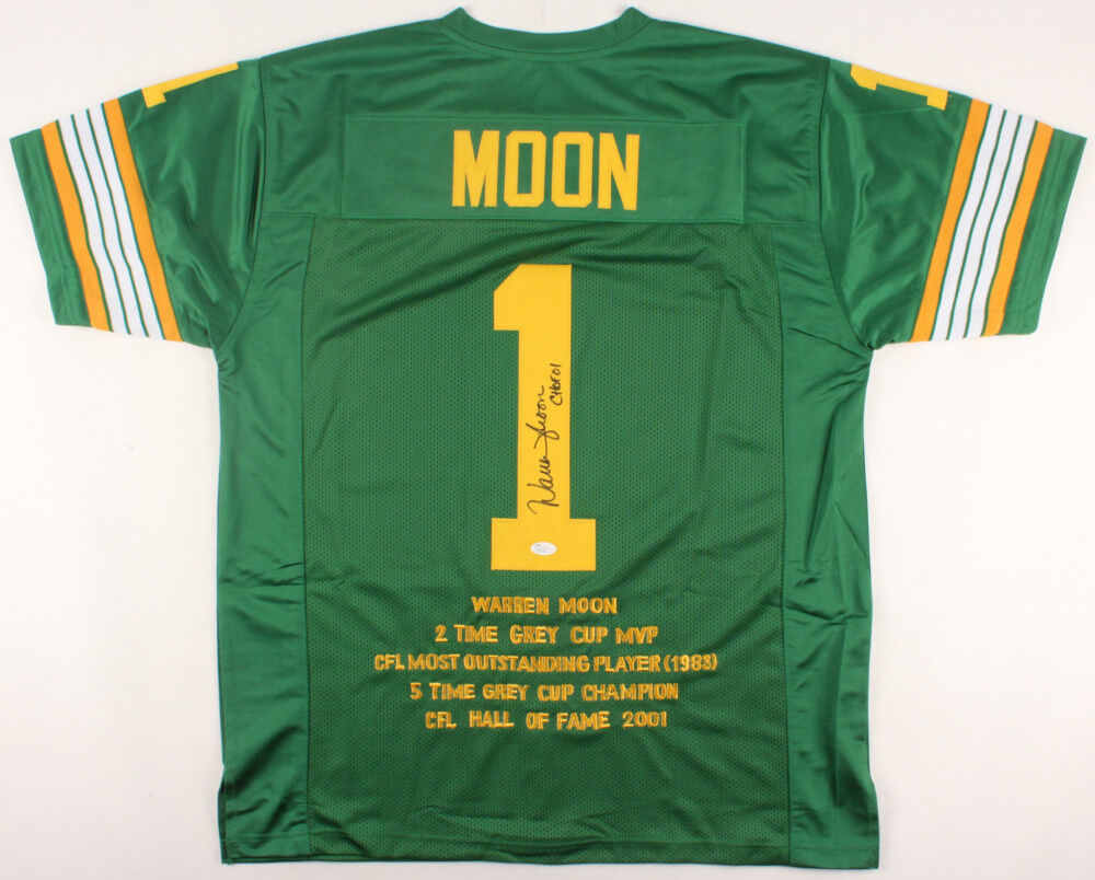 Custom on-field style jersey. Everything sewn on, size XL. Hand-signed and inscribed in black felt-tip pen by Warren Moon (HOF). Warren Moon's career stats have been custom stitched onto the back of the jersey below the reverse numbers. The autograph includes an official James Spence Authentication (JSA) hologram and matching COA for authenticity purposes.Authentication: JSA COA