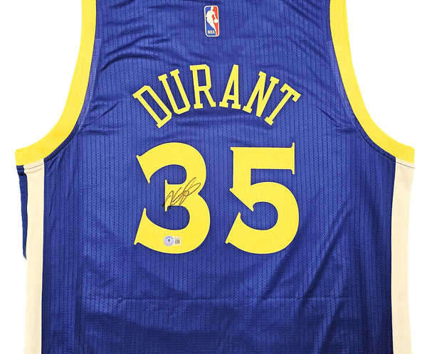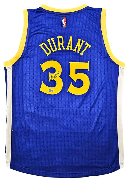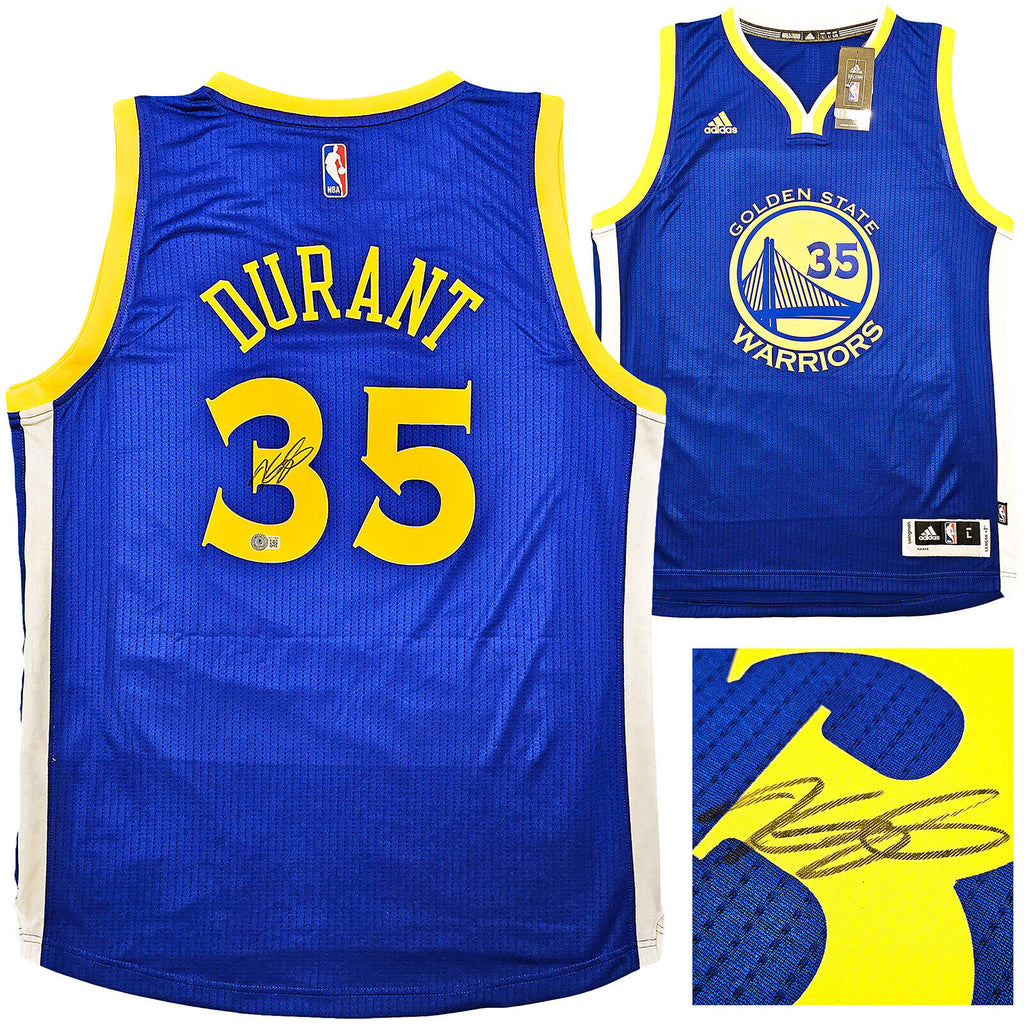 This is a Blue Adidas Golden State Warriors Swingman Jersey that has been hand signed by Kevin Durant. This jersey is Size L + 2 Length. This item has been certified authentic by Beckett Authentication (BAS) and comes with their tamper-proof QR Code sticker that can be verified on beckett-authentication.com.