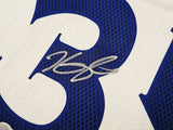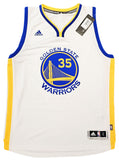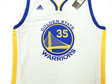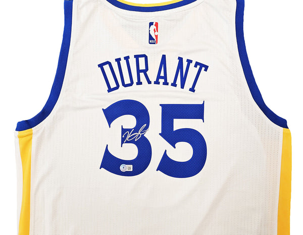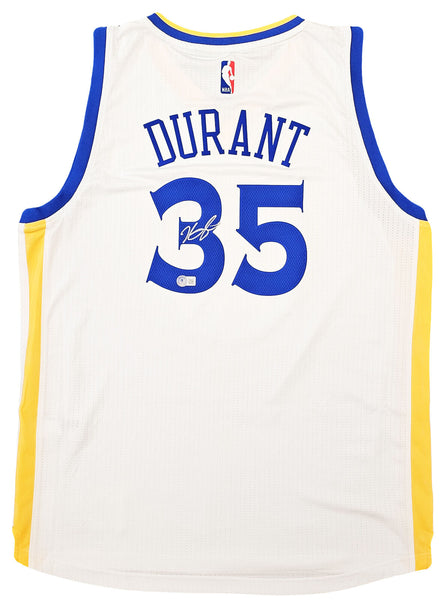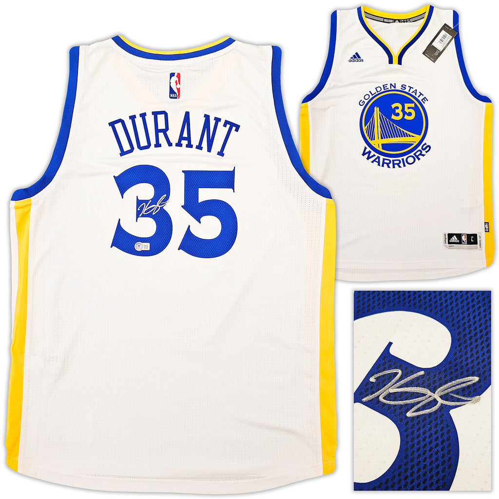 This is a White Adidas Golden State Warriors Swingman Jersey that has been hand signed by Kevin Durant. This jersey is Size L + 2 Length. This item has been certified authentic by Beckett Authentication (BAS) and comes with their tamper-proof QR Code sticker that can be verified on beckett-authentication.com.