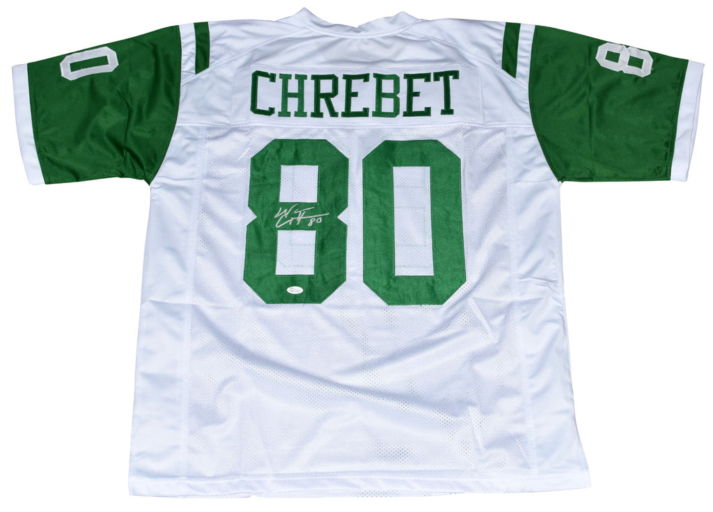 Wayne Chrebet, former star wide receiver for the New York Jets, has hand signed this white custom jersey at a private signing. Jersey is size XL and all letters/numbers are sewn-on. This item comes with a certificate of authenticity (COA) from JSA - James Spence Authentication and was signed in the presence of one of their representatives. You will receive a serial-numbered COA along with a matching serial-numbered sticker on the jersey. The authenticity can be verified online by entering the serial number.Item pictured may not be the exact item you will receive. It will be similar quality, and we guarantee your satisfaction.