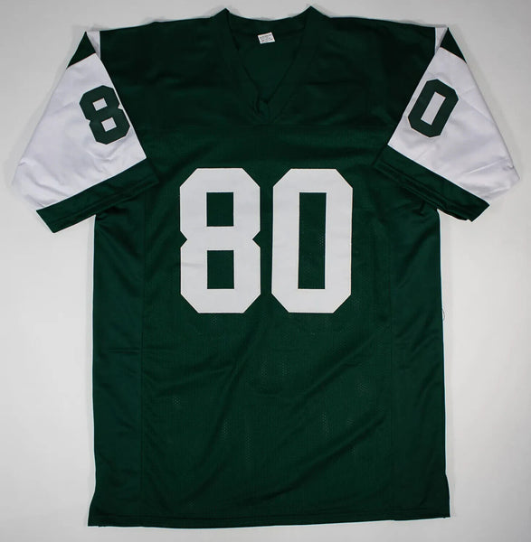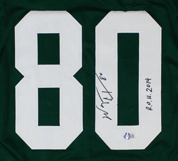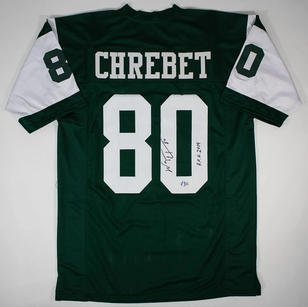 This autographed custom on-field style adult XL jersey has been personally hand-signed by Wayne Chrebet ("ROH 2014" inscription) of the New York Jets. This autograph is certified by Beckett Authentication Services (BAS) Witness Certification. That means that a Beckett representative was present when this item was signed. It comes with the numbered authentication hologram with a QR code card that verifies the authentication on the Beckett website.Custom on-field style jerseys are a more affordable option for autograph seekers. These jerseys do not have any brand name or tags and are made in the Philippines. They feature stitched on names and numbers and are made to look very similar to the on-field jerseys that the players wear. These custom jerseys are very commonly used in the memorabilia industry.