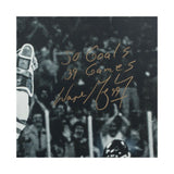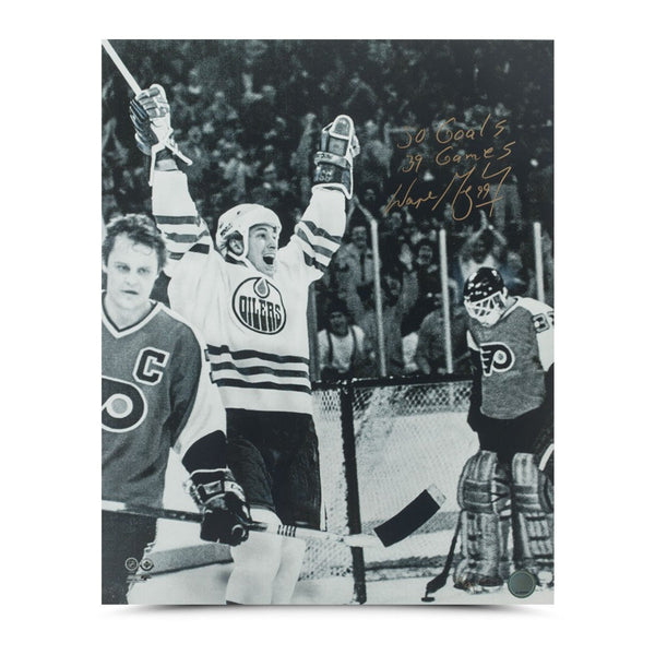 The date was December 30, 1981 and a young Wayne Gretzky scored his 50th goal in just the 39th game of the season. The previous mark was 50 goals in 50 games which is a rare achievement in the NHL®. By the 50th game of the 1981-82 season Gretzky recorded 61 goals. That season he finished with 92 goals and went on to accomplish the feat of 50 goals in 50 games in two more seasons with the Oilers®. In the 1984-85 season, Gretzky's 50th goal came on his 24th birthday in a 6-3 win over the Pittsburgh Penguins. Gretzky has inked his signature and inscribed "50 goals in 39 games" in black pen. His signature and inscription are deemed authentic by virtue of Upper Deck's Five Step Authentication.