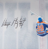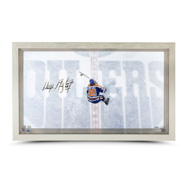 Universally known as "The Great One," and often referred to as one of the greatest sportsmen in history, there's no disputing the effect Wayne Gretzky has had on the sport of hockey and the sporting world in general. No. 99 finished his career as the all-time leader in goals (894), assists (1,963) and obviously points (2,857). He led the league in goals six times and led the league in assists an astronomical 16 times in his 21-year career. Gretzky is the only NHL player to surpass the 200-point mark in one season, something he did four times. He led the Oilers to four Stanley Cup championships. He left such an indelible mark on the NHL that he was immediately inducted into the Hockey Hall of Fame upon his retirement in 1999, and his number was retired league-wide. An athlete of Gretzky's magnitude deserves the most magnificent recognition. This memorabilia item features an acrylic piece encased in a silver metal frame that measures 28.75" x 16.75". It showcases an image shot from above of Gretzky skating in an Oilers uniform along with his autograph on the acrylic. The design and shadow reflect off the back layer, which gives it the feel of an actual ice rink. The thick metal frame gives it a classy look and gives the full piece a measurement of 30.5" x 18.5". Gretzky has signed this Great From Above Acrylic Display in black paint pen. His signature is deemed authentic by virtue of Upper Deck Authenticated's Five Step Process.