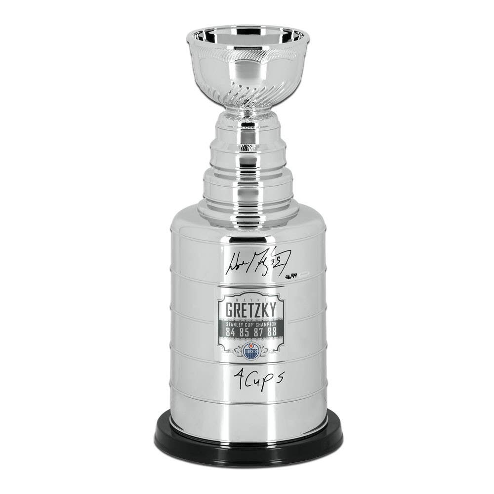 NHL Hall of Famer Wayne Gretzky won four Stanley Cups with the Edmonton Oilers in 1984, 1985, 1987 and 1988 seasons. Gretzky played 20 seasons in the NHL and half of them were with the Oilers. Gretzky made an impact as an 18-year-old. He scored 137 points in 79 games and the league took notice. He hit 1,000 points in only the 424th game. The Edmonton Oilers retired his No. 99 on October 1, 1999. Gretzky has autographed and inscribed '4 Cups' on this limited edition (99) replica Stanley Cup trophy with a special plaque in black paint pen. His signature and inscription are deemed authentic by virtue of Upper Deck Authenticated's Five-Step Process. At the heart of the policy are the requirements that each signing be witnessed by an Upper Deck employee, and matching serially numbered holograms affixed to each signed item and its corresponding certificate of authenticity.