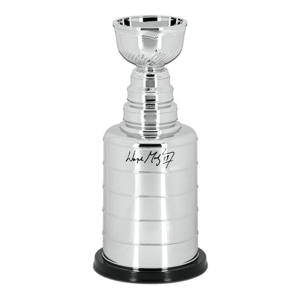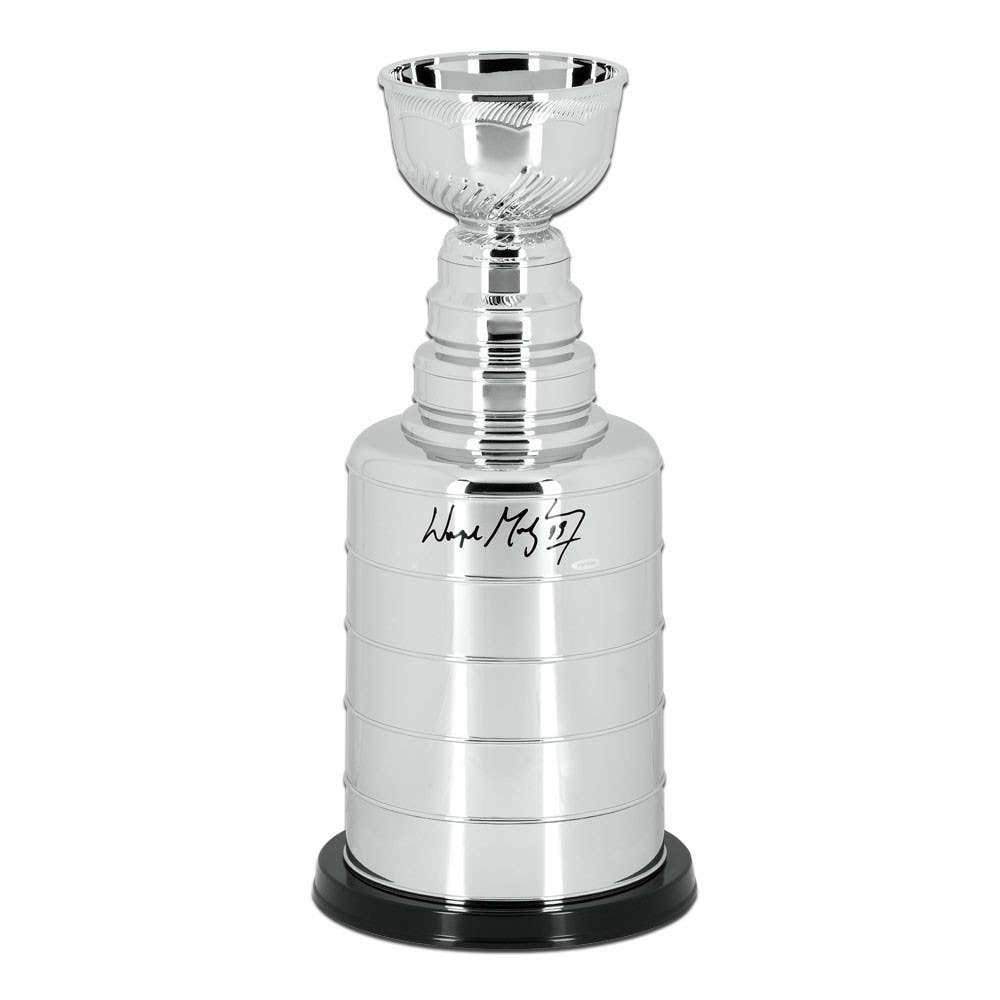 Wayne Gretzky helped built a dynasty in the 80's with the Edmonton Oilers. Gretzky won four Stanly Cups in his ten year career with the organization. In the 1981-82 season, Gretzky broke Phil Esposito single season goal record of 76 he finished the season with 92 goals. Gretzky holds or shares 61 National Hockey league records. Wayne Gretzky played his final NHL game on April 18, 1999, and was quickly inducted into the Hockey Hall of Fame. Gretzky has inked his signature on this replica Stanley Cup trophy in black pen. His signature is deemed authentic by virtue of Upper Deck's Five Step Authentication. At the heart of the policy are the requirements that each signing be witnessed by an Upper Deck employee, and matching serially numbered holograms affixed to each signed item and its corresponding certificate of authenticity.