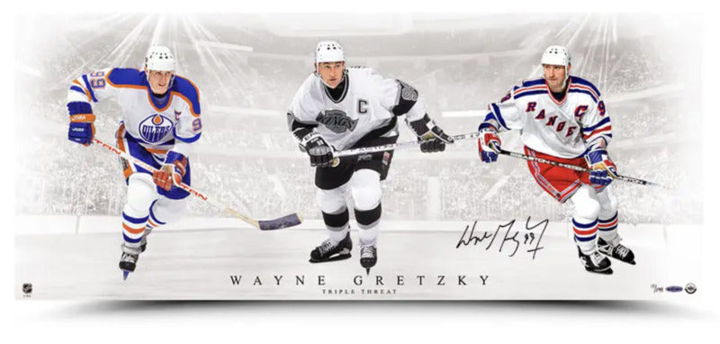 Wayne Gretzky interestingly spent 99.9% of his illustrious NHL playing career as a member of the three teams (Oilers, Kings, and Rangers) depicted in this UDA designed image. Gretzky is shown in the home white jersey chronologically from left to right. Wayne briefly played for the St. Louis Blues during the 1995-96' season between his stint in LA and New York. Ironically, these jerseys would presently be considered his away jerseys after the NHL switched the home and away jersey color during the 2003-04 season. "Triple Threat" is a 36"x15" image in which Gretzky has inked his name in black paint pen. Gretzky's signature was witnessed under Upper Deck Authenticated's Five-Step Authentication Process.
