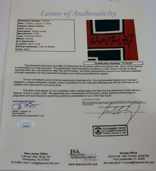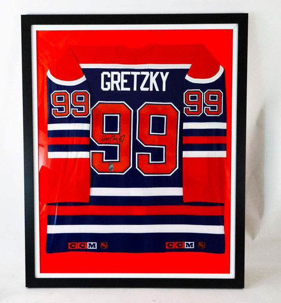 Details Edmonton Oilers Blue Home CCM Jersey Autographed by Wayne Gretzky Black Ink Signature JSA Authentication - Full Letter WG Authentication Deluxe Framing Includes Orange Suede Matting Width - 36" Height - 44" Immerse yourself in hockey history with our Custom Framed Wayne Gretzky Autographed Edmonton Oilers Blue Home CCM Jersey. This exceptional piece not only features The Great One's black ink signature but is also meticulously authenticated by JSA (James Spence Authentication) with a Full Letter and WG Authentication, ensuring the utmost legitimacy. Adorned with the iconic black ink signature of Wayne Gretzky, this CCM jersey is a symbol of his unparalleled achievements with the Edmonton Oilers. Whether you're a die-hard Oilers fan, a hockey enthusiast, or a collector of sports memorabilia, this autographed jersey is a centerpiece addition to your collection. Deluxe Framing Includes: Orange Suede Matting, providing a touch of sophistication With dimensions measuring 36" in width and 44" in height, this framed jersey is a standout addition to any sports memorabilia collection. This custom-framed jersey is more than a collector's item; it's a tribute to Wayne Gretzky's enduring legacy in the world of hockey. Elevate your sports memorabilia collection with this exceptional piece. Order your Wayne Gretzky Autographed Edmonton Oilers Blue Home CCM Jersey now and proudly showcase the spirit of The Great One! #WayneGretzky #EdmontonOilers #HockeyMemorabilia #JSAAuthentication *Cannot combined with any other offers*
