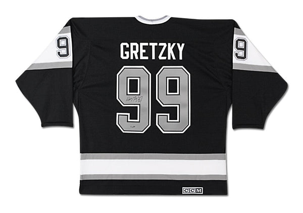 Wayne Gretzky began the 1988-89 NHL season as a member of the Los Angeles Kings after leaving the only professional hockey team he had known. For eight seasons, Wayne Gretzky maintained his hall of fame level play while wearing the iconic number 99 as a member of the Kings. While one fan base was disappointed with his departure, the 'Great One' was capturing a new avid fan base in southern California. The ‘Great One' has signed the back of this replica CCM jersey in black paint pen. Gretzky's signature was witnessed under UDA's Five-Step Authentication Process.