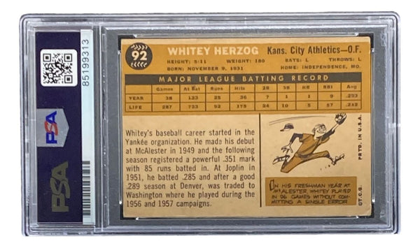 Featured is a Whitey Herzog signed 1960 Topps #92 trading card. This card has been hand signed by Herzog and has been authenticated and encapsulated by PSA/DNA. This card would make a great addition to any sports memorabilia collection! SPECIFICATIONS Autographed By: Whitey Herzog Team: Sport: Baseball Authentication: Professional Sports Authenticator (PSA)