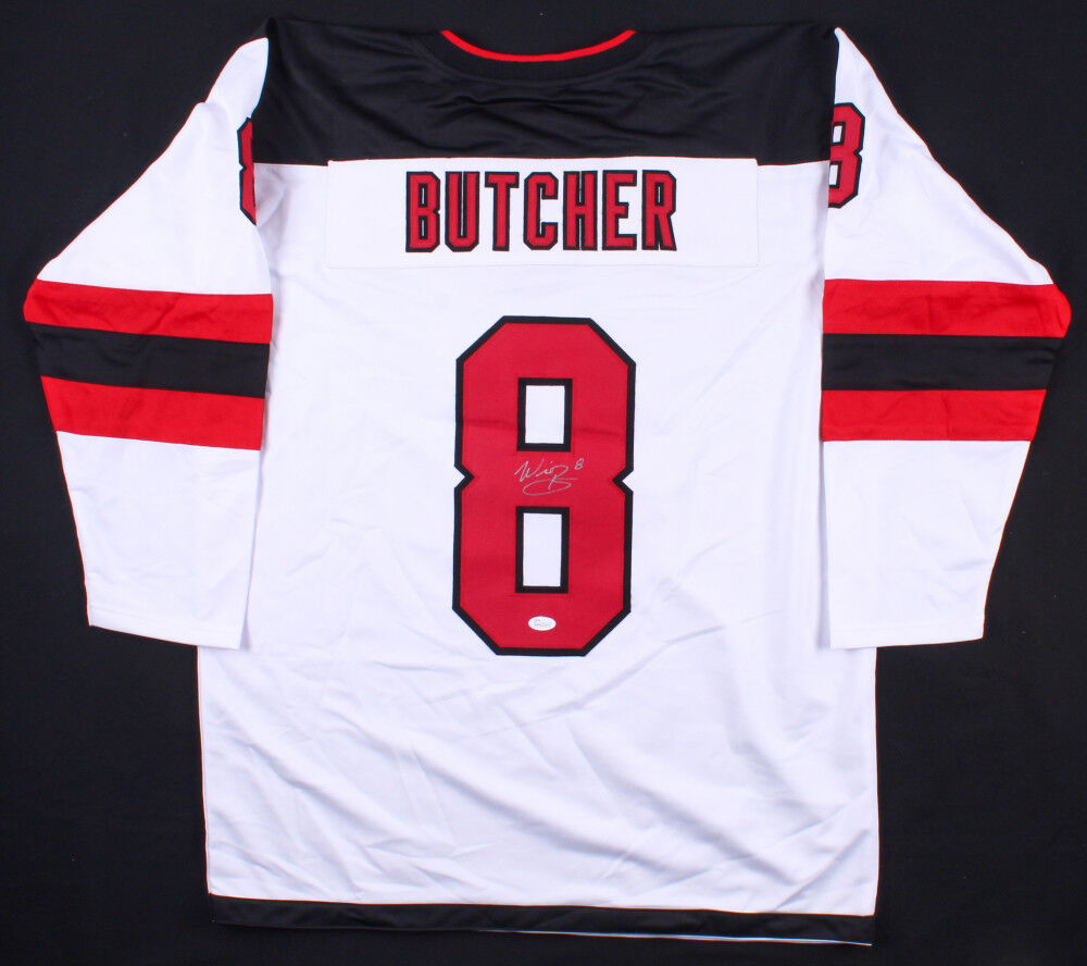 Custom on-ice style jersey. Everything sewn on, size XL. Hand-signed in silver paint pen by Will Butcher. The lot / autograph(s) includes an official James Spence Authentication (JSA) hologram and matching COA for authenticity purposes. The signing of this item was witnessed by JSA.Authentication: JSA COA