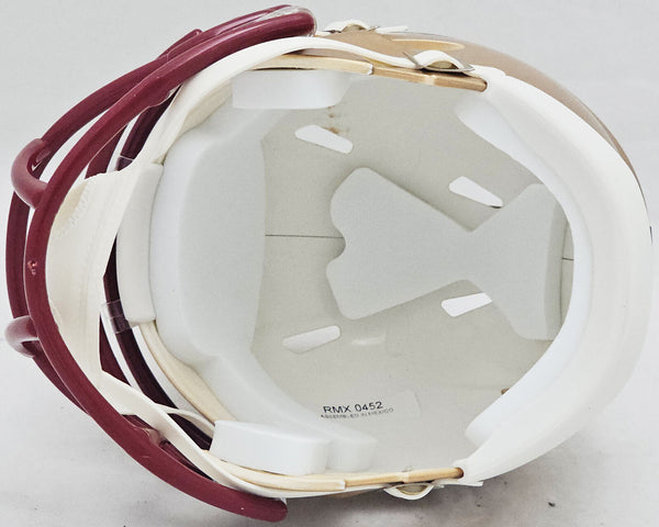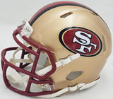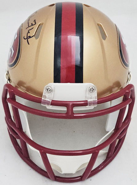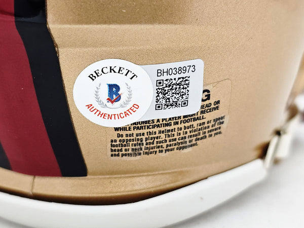 This is a San Francisco 49ers Gold 96-08 Throwback Speed Mini Helmet that has been hand signed by William Floyd. This item was inscribed "Bar None." This item has been certified authentic by Beckett Authentication (BAS) and comes with their tamper-proof QR Code sticker that can be verified on beckett-authentication.com.