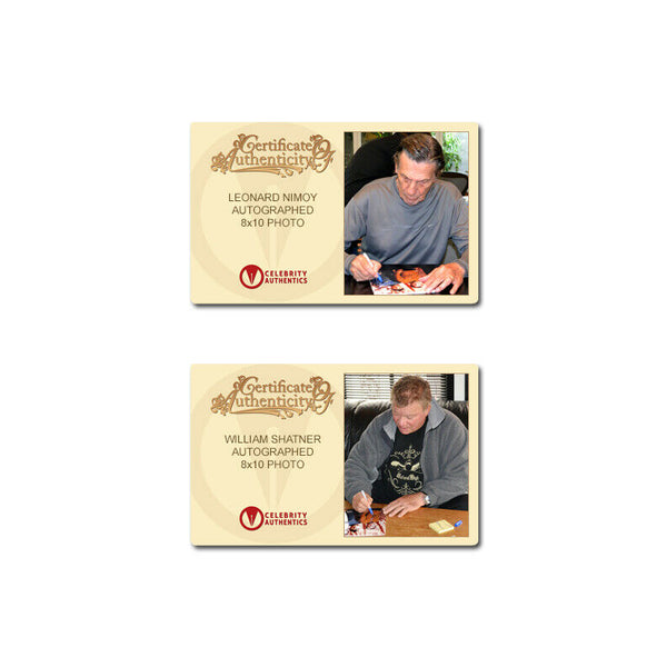 This 8x10 photo from Star Trek of William Shatner as Captain James T. Kirk and the late Leonard Nimoy as Mr. Spock has been personally hand-signed by William and Leonard during their autograph signings with Celebrity Authentics. Terrific shot of Captain Kirk and Mr. Spock landing on a strange and distant planet. Ships affixed with Celebrity Authentics serial-numbered and tamper evident Authentication Hologram and includes Celebrity Authentics Certificates of Authenticity featuring picture of Leonard and William signing photo. Please note: with multiples signed by the actor, a sample photo is used from stock to represent what you will receive. Exact autograph size and placement may vary.