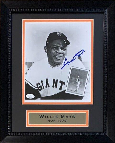 Willie Mays has autographed this 8x10 photo of him. Just an iconic image. Autograph is authenticated by James Spence Authentication (JSA) and comes with their unique hologram # and COA verified on their site. Frame measures 13x16 and comes ready to hang. Receive exact item shown.