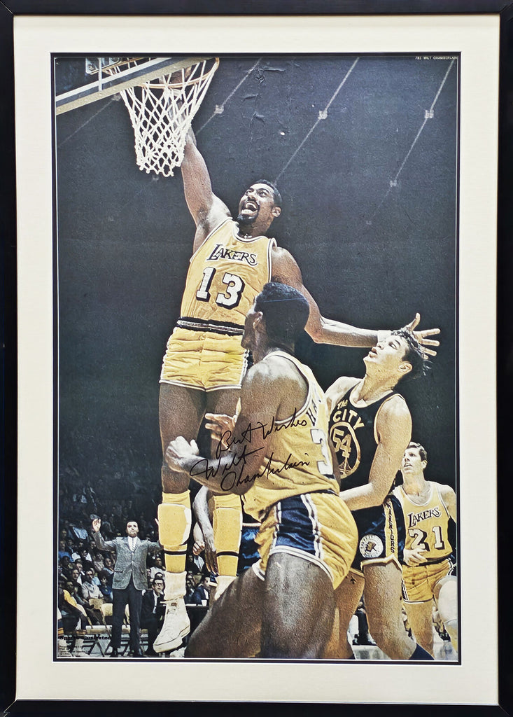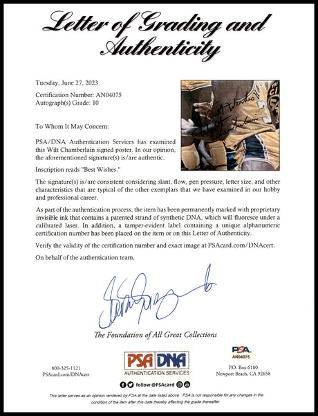 This is a Framed 24x36 Sports Illustrated Poster Photo, approximately 29x41 with the frame, that has been hand signed by Wilt Chamberlain. This item was inscribed "Best Wishes." The condition of the signature was graded a Gem Mint 10 by Beckett BAS.A There are creases in the poster as shown. This item has been certified authentic by PSA/DNA and comes with their tamper-proof hologram and matching full-page certificate of authenticity.