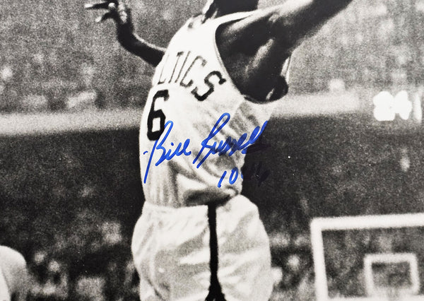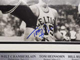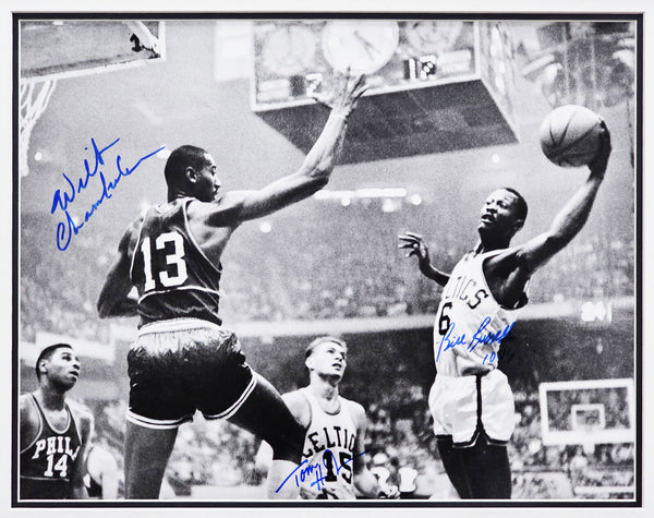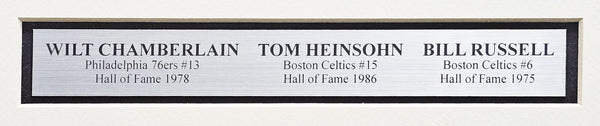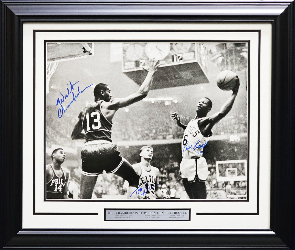 This is a Framed 16x20 Photo, approximately 24x28 with the frame, that has been hand signed by Wilt Chamberlain, Bill Russell & Tom Heinsohn. This item has been certified authentic by JSA and comes with their tamper-proof hologram and matching full-page certificate of authenticity.