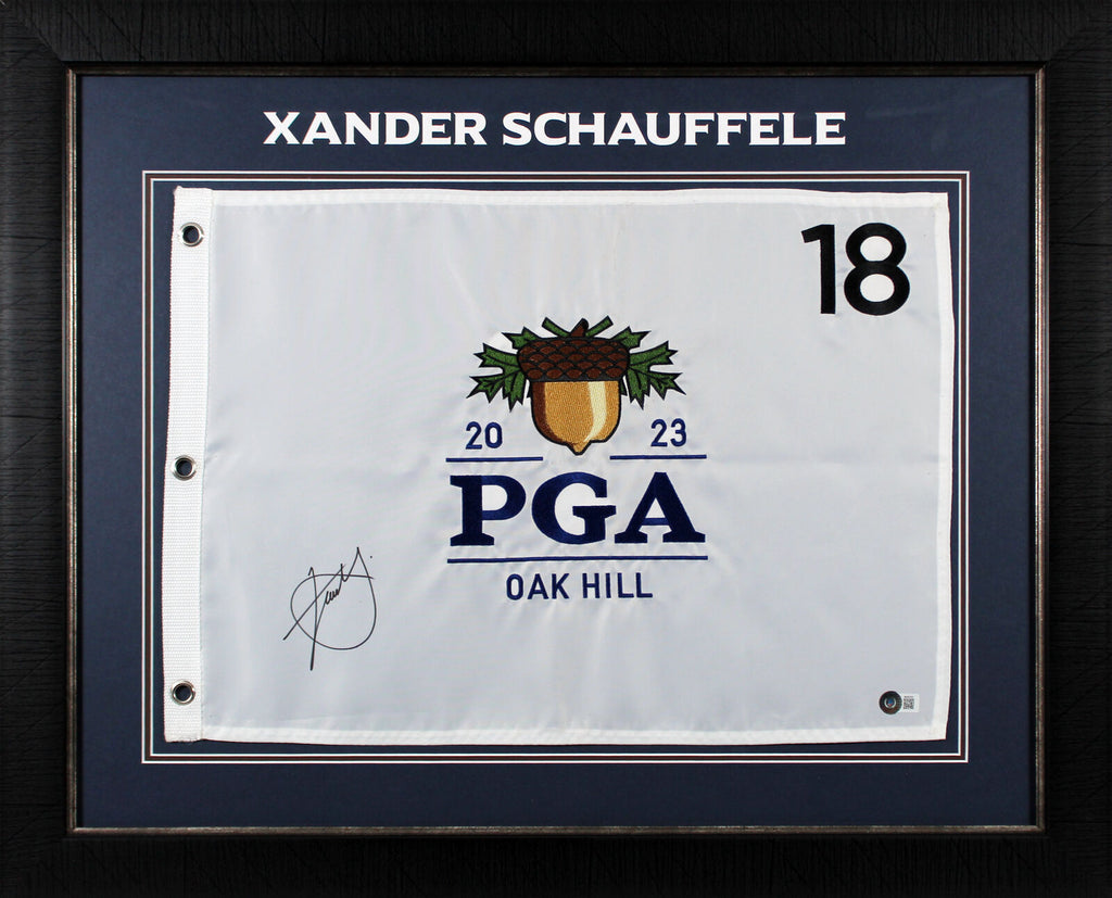 This Autographed & Framed 2023 Oak Hill PGA Championship Pin Flag has been Personally Signed by Xander Schauffele. This item is 100% Authentic to include a hologram by Beckett Authentication Services. This item will come with an affixed Beckett Authentication Services (BAS) authentication sticker, which includes a scannable QR code to verify authenticity. Please note that Beckett no longer provides serial-numbered COA cards, and the attached BAS sticker will serve as the complete authentication for this item. The authenticity can be verified on Beckett Authentication Services website. This item has been professionally framed to overall dimensions of approximately 23.5 x 28.5 inches.