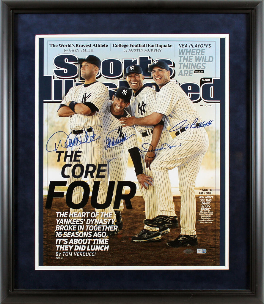This Autographed 16x20 Framed Photo has been Personally Signed by Derek Jeter, Mariano Rivera, Jorge Posada & Andy Pettitte of the New York Yankees. This item is 100% Authentic to include a numbered hologram from MLB. The authenticity can be verified on MLB website. This item has been professionally framed to overall dimensions of approximately 22 x 26 inches.