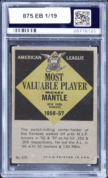 This Autographed 1961 Topps MVP #475 Card has been Personally Signed by Mickey Mantle of the New York Yankees. This item is 100% Authentic, it comes slabbed and authenticated by PSA/DNA. The authenticity can be verified on Professional Sports Authenticator website.