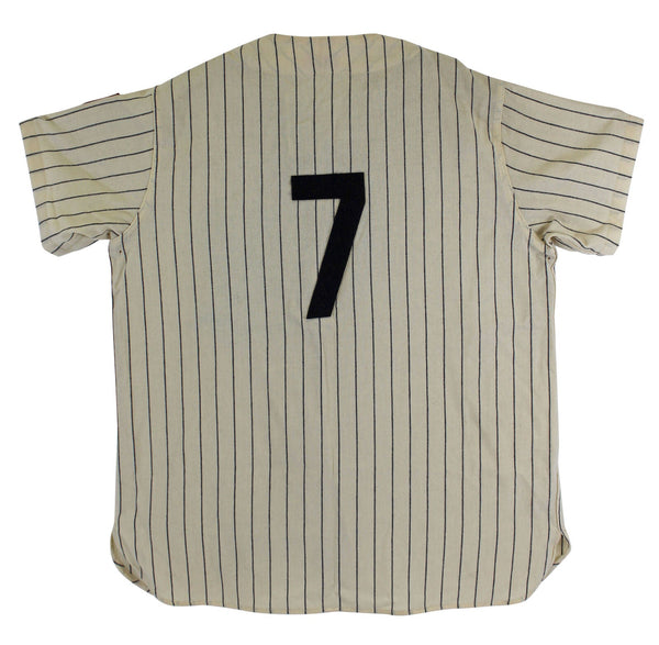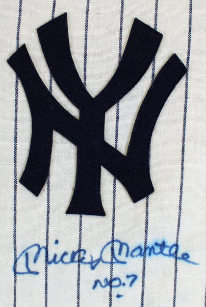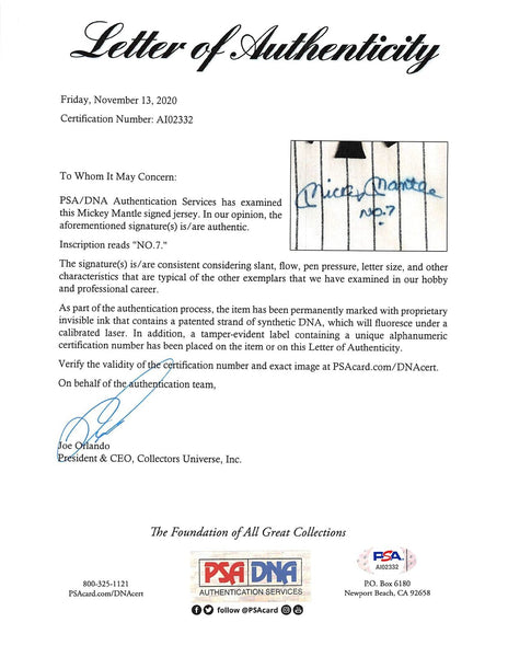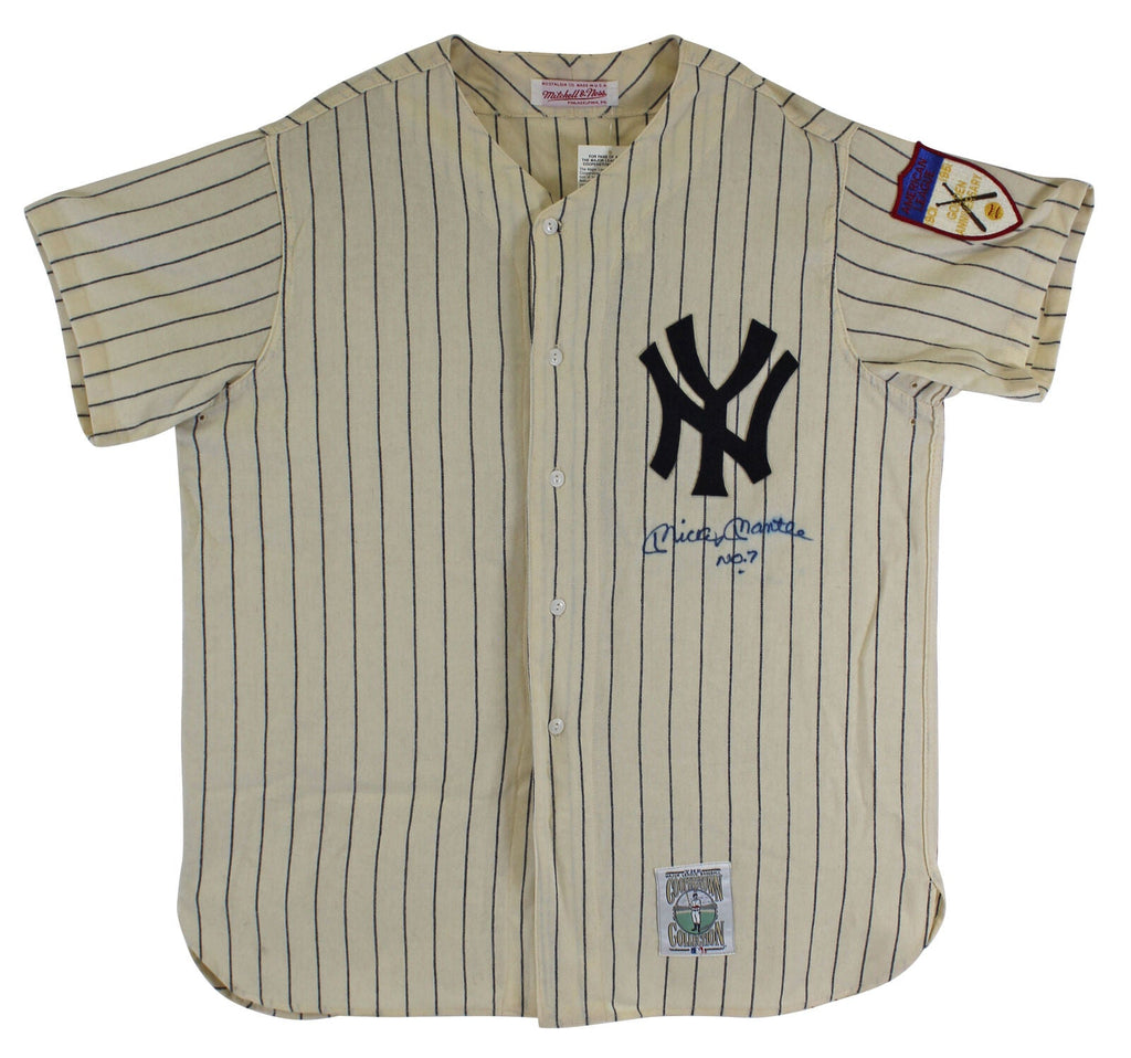 This Autographed Mitchell & Ness Cooperstown Collection Pinstripe Jersey with the inscription of "No. 7" has been Personally Signed by Mickey Mantle of the New York Yankees. This item is 100% Authentic and comes with a PSA/DNA Certification Card and a matching numbered Hologram. The authenticity can be verified on Professional Sports Authenticator website.