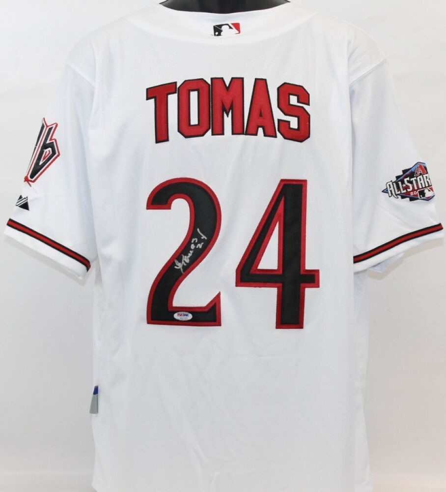 Custom on-field Majestic style jersey, everything is sewn on. The jersey has been hand-signed in silver paint pen by Yasmany Tomas The lot / autograph(s) includes an official PSA/DNA hologram and matching COA for authenticity purposes. Authentication: PSA COA
