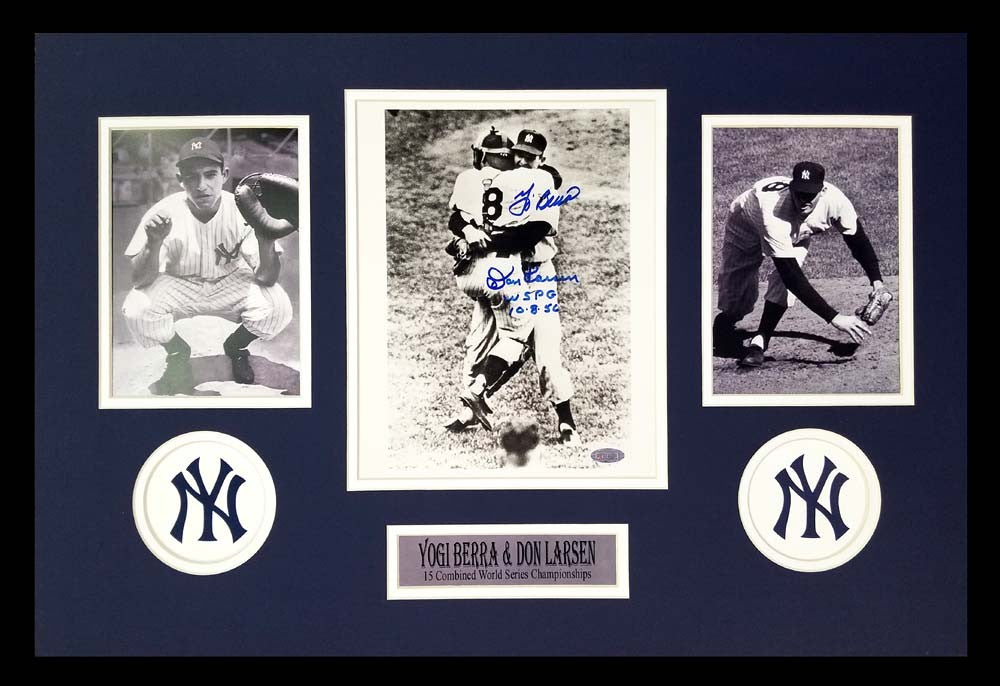 A New York Yankees Black and White Framed 8x10 Photo hand signed by Yogi Berra & Don Larsen. The item and signatures are in excellent condition. The frame measures approximately 26"x16". The framed photo is accompanied by two 4"x6" photos. In addition to signing his name, Don inscribed "WSPG 10.8.56" on the item. AUTHENTICATION: The item is accompanied by a Steiner Sports Certificate of Authenticity - Steiner Sports Serial Numbered and Databased Hologram.