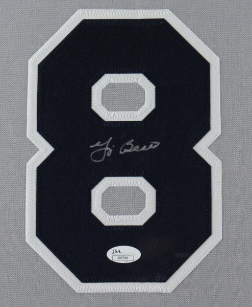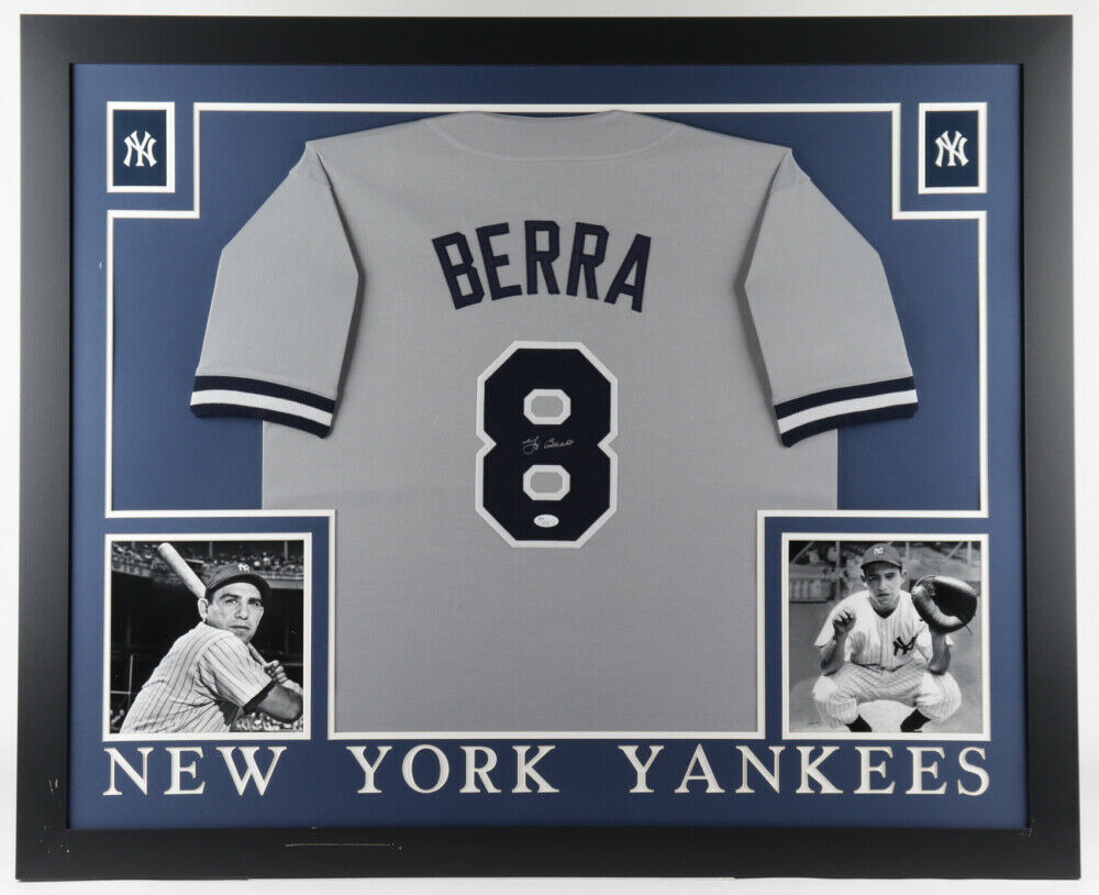 Custom frame measures approximately 35" x 43" in size and features a jersey which has been hand-signed in silver paint pen by Yogi Berra. The lot / autograph(s) includes an official James Spence Authentication (JSA) hologram and matching COA for authenticity purposes. Authentication: JSA COA