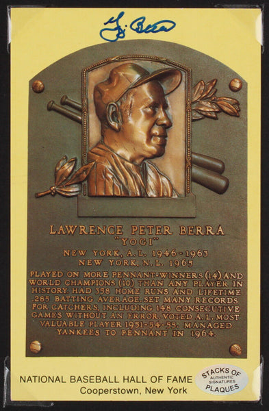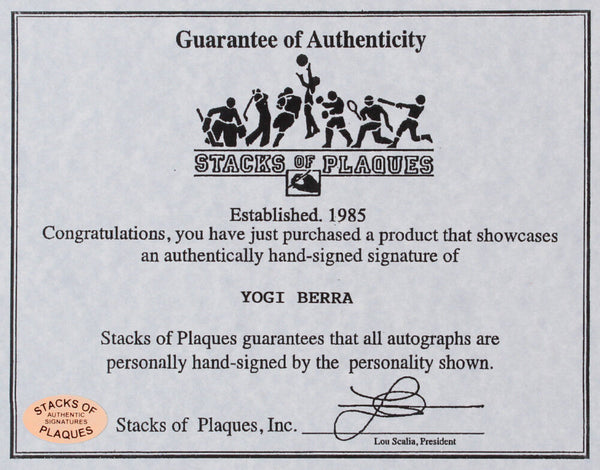 Custom matted display measures 14" x 18" in size and features a 8" x 10" photo as well as a Hall of Fame postcard that has been hand-signed in blue felt-tip pen by Yogi Berra (HOF). The lot / autograph(s) includes an official Stacks of Plaques hologram and matching COA for authenticity purposes. Est. 1985, celebrating 30 plus years in the business.Authentication: Stacks of Plaques COA